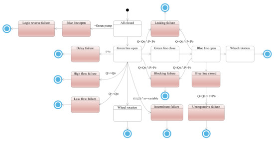 The SMD of SysML can show the different states of the components, and the transformation relationship between them. The failure logic of the brake system described by the SMD is shown in Figure 7. In this case, the key process variables are quantity of flow: Q, pressure: P and time: T. The arrows represent transitions between different states, and the text above them is a mathematical description of the failure deviation.