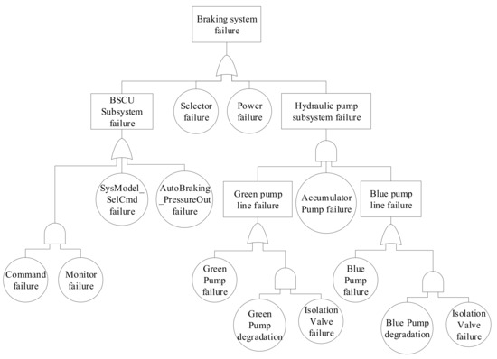 According to the results of the single-failure and double-failure simulations, the fault propagation paths of the brake system can be deduced. Through analyzing the fault propagation paths, the fault tree of the brake system can be obtained, as shown in Figure 9. The propagation of single failure is represented by an OR gate in the fault tree, while the propagation of double failure is represented by an AND gate.