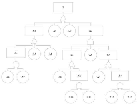 Next, we use letters and numbers to present the failure events, as shown in Figure 10. The purpose is to facilitate the calculation of the minimum cut set.