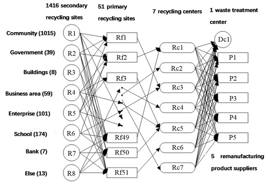 The reverse logistics network is shown in Figure 5. There are 1416 secondary recycling sites, 51 primary recycling sites, seven recycling centers, one waste treatment center and five remanufacturing product suppliers, which are distributed in various administrative districts of Shanghai. This paper is focused on these 51 primary recycling sites, which have a large amount of return and spatial correlation.