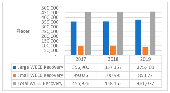 From 2017 to 2019, the statistics of return amount of large and small waste electronic products of J company are shown in Figure 6 and the total number in three years has reached 1,375,155. Large and small pieces are divided by product volume. For example, large waste electronic products include refrigerators and televisions, while small waste electronic products refer to mobile phones and batteries. All these waste electronic products are recycled through 51 primary recycling sites.