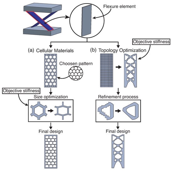 Process to tailor stiffness of flexure elements via (a) Cellular Materials and (b) Topology Optimization (Figure based on that in [52]).