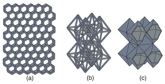 Cellular Materials are essentially patterns that, in contrast to their homogeneous counterparts, are heterogeneous materials that have a unit-cell and repetition which leads to a structured distribution of material and voids [60]. Cellular Materials can be random or periodic, the latter are defined by a unit-cell that is repeated (combining material and voids). Therefore, a cellular solid is one made up of an interconnected network of solid struts or plates which form the edges and faces of cells. Typical cellular structures are shown in Figure 3. Two-dimensional (2D) patterns are called honeycombs (Figure 3a). 3D Cellular Materials are called foams and can be open- and closed-cell (Figure 3b,c).