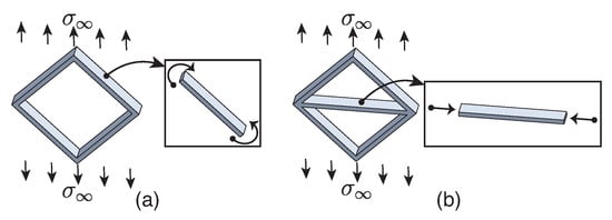 According to their deformation mechanism, cellular Materials are classified into two main groups: bending-dominated and stretch-dominated structures [71]. When loaded, the cellular elements of the structured material can respond by bending or stretching-shortening; thus, they are said to be bending- or stretch-dominated (Figure 4a,b), respectively. Therefore, customization of the stiffness via Cellular Materials is possible as their apparent mechanical properties show dependence on the following: (i) the mechanical properties of the parent material, (ii) the topology and cell geometry, and (iii) the relative density. Properly planned selection or modification on any of these three can lead to a meta-material with tailored properties. In this regard, the stiffness of a compliant system can be modified through the implementation of specific cellular arrays in the flexible parts of the system.