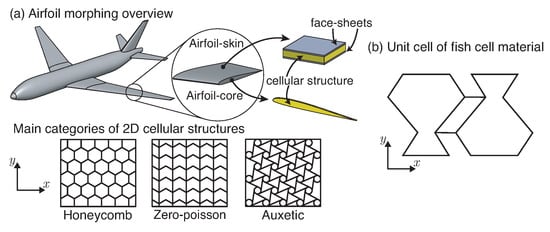 (a) Complete schematic overview of airfoil morphing and main categories of 2D cellular structures, and (b) unit-cell of the zero-Poisson’s ratio cellular material termed as“Fish cell” (figure adapted from in [125]).