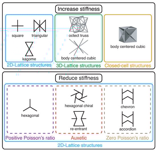 In the process of tailoring stiffness via cellular materials approach, certain topologies are preferred depending on the stiffness objective (increase stiffness or reduce stiffness). When stiffness maximization is the objective, a stretch-dominated lattice and closed cell structures are preferred. On the other hand, if flexibility is the goal, a bending-dominated auxetic and zero-Poisson’s ratio honeycombs are the most commonly used. The unit-cells of some of the most commonly used cellular structures for tailoring stiffness are shown in Figure 6. Increasing stiffness via cellular materials has been widely studied; therefore, unit cells for this objective, shown in Figure 6, are categorized in 2D-lattice structures, 3D-lattice structures, and Closed-cell structures. On the other hand, reducing stiffness via cellular materials has been limited to explore 2D-lattice structures; thus, unit cells for reduce stiffness, shown in Figure 6, are only in the category of 2D-lattice structures, nevertheless, they are separated according to their Poisson’s ratio behavior in positive Poisson’s ratio, auxetic, and zero-Poisson’s ration.