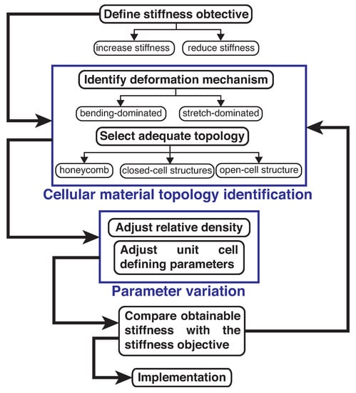 Additionally, to address properly the problem of tailoring stiffness via cellular materials, it is convenient to follow the next guideline. First, define the stiffness objective (increase or reduce stiffness). Then, identify the appropriate cellular material, for which it is necessary to identify the desired deformation mechanism (bending-dominated or stretch-dominated) and select an adequate topology (honeycomb, closed-cell structure, or open-cell structure). After, adjust the unit-cell parameters (geometry and relative density) to modify the stiffness of the cellular material. Afterward, compare the obtainable stiffness with the stiffness objective and evaluate if the cellular material is adequate. Next, if the objective stiffness is achieved, then the final step is the implementation. On the other hand, if the objective stiffness is not be achieved with the selected cellular material, then return to the topology identification step and repeat the process. The above-mentioned guideline is summarized in the diagram shown in Figure 7.