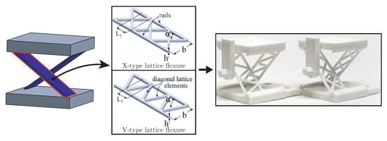 There is a great amount of evidence for the capability of Cellular Materials to achieve desired levels of compliance in certain directions while maintaining high levels of stiffness in others. However, only Merriam and Howell [22] have applied a cellular lattice structure directly in the flexures elements of compliant joints, as shown in Figure 8. In [22], Merriam and Howell introduced the concept of lattice flexure, which was not common before additive manufacturing techniques were widely available. They demonstrated that these types of flexures have a reduced bending stiffness when compared to traditional rectangular-section blade flexures of similar dimensions while maintaining comparable stiffness in off-axis directions. Making use of additive-manufactured flexures, they found that both type of lattice flexures—X-type and V-type—shown in Figure 8 have the potential to reduce the bending stiffness by 60–80% compared to a traditional blade flexure of similar size, and at the same time to exhibit a torsional/bending stiffness ratio as much as 1.7 times higher than an equal aspect-ratio blade flexure, and a transverse bending/motion-direction bending stiffness ratio up to 6.5 times higher than an equal aspect-ratio blade flexure.