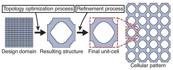 Thus, by selecting a specific objective function F in Equation (1), it is possible to create structures with customized properties, e.g., stiffness. When the design domain has a simple geometry and is free of specific boundary conditions, the topology-optimized result is often a cellular pattern [56] (Figure 2b). In addition, structures resulting from Topology Optimization processes need a postprocessing refinement in order to smooth the jagged curves generated from the discretized domain and to achieve manufacturability [150]. As with the use of Cellular Materials, the main efforts of Topology Optimization processes have been focused in reducing mass while maximizing stiffness [151,152,153,154]. Then, the basic process shown in Figure 2b is hereafter termed as Topology Optimization Resulting in Cellular Patterns (TORCP).