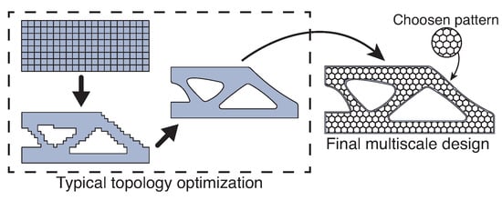 The maximization of stiffness by combination of the Topology Optimization and Cellular Materials techniques has also been explored. Two main concurrent methodologies were identified: The first begins with the typical Topology Optimization process to generate a conceptual design in the design domain. After that, the generated design is filled with a cellular structure especially selected to improve the optimization of the objective property. This concurrent method is termed here as Multiscale Topology Optimization with Cellular Materials (MTOCM), and it is graphically explained in Figure 10. Examples of relevant works using MTOCM approach can be found in [171,172,173,174,175].