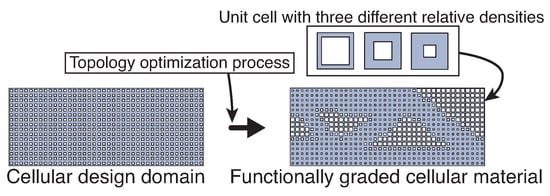 The second concurrent methodology consists in modifying the relative density of the cellular design domain based on a Topology Optimization process, obtaining the so-called functionally graded Cellular Materials. Modification of the unit-cell relative density can be made by altering cell parameters [176] or by using different unit-cell topologies [177]. This methodology is termed as Topology Optimization of Functionally-graded Cellular Materials (TOFCM), and it is graphically explained in Figure 11. Other, examples of relevant works using TOFCM approach can be found in [178,179,180,181,182].