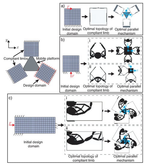 Schematic description of the Topology Optimization process to design the optimal compliant limbs of 2D compliant parallel mechanisms: (a) 3-DoF () compliant parallel mechanism proposed by Lum et al. [200] (Adapted from [200] 2015, Elsevier); subfigures (b,c) are the 2-DoF () and the 3-DoF () compliant parallel mechanisms, respectively, proposed by Jin et al. found in (i) [201] (Adapted from [201] 2016, Elsevier); and (ii) [202] (Adapted from [202] 2018, ASME).