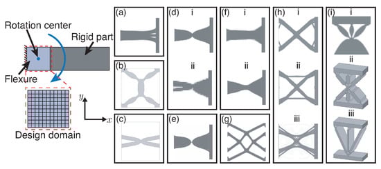Schematic description of the Topology Optimization process to design the optimal configuration of SARFJ using a 2D rectangular design domain. Optimal designs were obtained in (and adapted from) (a) [207]; (b) [208]; (c) [209]; (d) [210] i-design based on linear FEA and ii-design based on nonlinear FEA; (e) [211]; (f) [212] i-design with less stress allowed for a mesh of 50 × 50 and ii-design with less stress allowed for a mesh of 100 × 100; (g) [213]; (h) [214] i-design for general distributed flexure hinges, ii-design for distributed flexure hinges with prescribed compliances, and iii-design for distributed flexure hinges with minimal parasitic motion; and (i) [56] i-optimal topology, ii-simplified design named “Snowflake”, and iii-simplified design named “‘Half-Snowflake”.