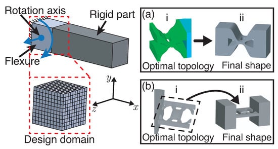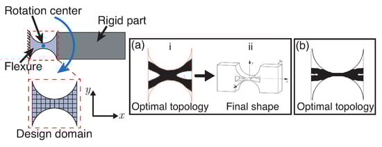 Schematic description of the Topology Optimization process to design the optimal configuration of SARFJ using a 2D design domain based on the geometry of a right circular flexure hinge. Optimal designs obtained: (a) i-optimal topology and ii-final shape (Adapted with permission from ref. [215]. 2021, Elsevier) and (b) optimal topology obtained in [209] (Adapted from ref. [209]. 2019, Springer).