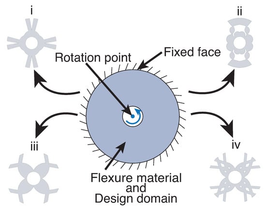 Topology Optimization has also been used to find the optimal material distribution in a less common type of flexure joint called “compliant revolute joint” (Figure 16). The compliant revolute joint consists of a thin cylinder of compliant material with a inner hollow where its external face is fixed and its internal face is subject to a rotational displacement produced by a tangential force applied at the same face. Li et al. [222,223,224] presented a series of works dealing with the Topology Optimization of this type of flexure joint. In [222], the authors designed new compliant revolute joints reconstructed after removing material with a Topology Optimization process. The obtained designs are shown in Figure 16(i–iv). FEA was used to compare the performance of the optimized designs with the non-optimized compliant revolute joint. Results showed that optimized designs can achieve more rotational displacement. However, their stress levels were also increased. Further experimental validation in the rotational angle and stress levels of the optimal designs was performed in [223], obtaining a maximum error between experimental and FEA results of 8.7%. This was expanded in [224], by modeling the compliant revolute joint as a kinetoelastic model considering the kinematic properties and structural elastic properties simultaneously. This approach allowed obtaining optimized compliant revolute joints with desirable compliance properties that are quite similar to those obtained in their previous works.