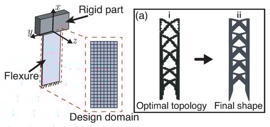 Schematic description of the Topology Optimization process to design the optimal configuration of SATFJ using a 2D design domain based on the geometry of blade flexures. (a) Optimal design obtained in [52] i-optimal topology and ii-final shape (reprinted with permission from [52]. 2019, Elsevier).