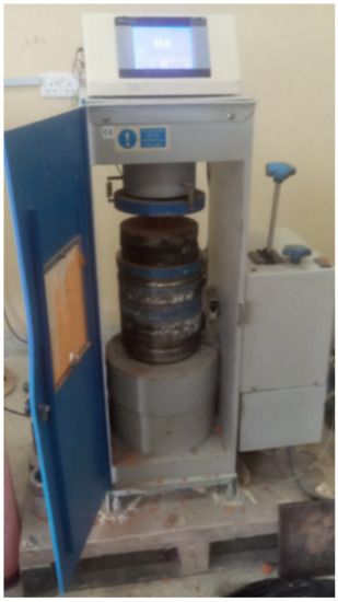 The compressive strengths of geopolymer ceramics were measured with a Universal Mechanical Testing Machine series model 2810 (Figure 3) after 7 days of casting. Low curing temperatures of 30 °C and 50 °C for 24 h were chosen to reduce energy cost and to prevent initial cracks during water evaporation in the curing process [42].