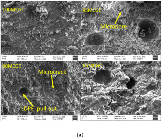 Figure 4a,b is the SEM micrograph of geopolymer ceramics samples. The Aluminum sample holders were coated with G303 colloidal graphite and the samples were coated with gold to prevent sample charge. Aluminum and silicate were the main morphological features on the SEM-EDX of geopolymer ceramics (Figure 5a,b) and agrees with the chemical composition result in XRF. SEM micrograph analysis of surface of the geopolymer ceramics samples showed evidence of microcracks, due to the pull-out of undissolved LDPE particles from composite samples (Figure 4a,b). The pull-out and undissolved LDPE particles (Figure 4b) supported the fact that particles did not take part in the geopolymerization reaction.