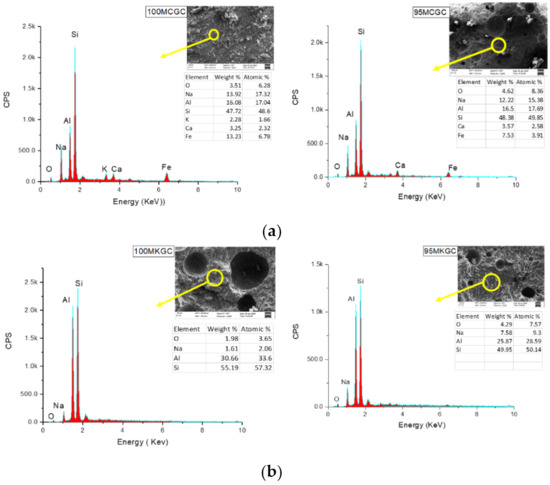 Figure 5a,b showed EDS micrographs of geopolymer ceramics representing the presence of alumina, silica, sodium oxide and calcium oxide. The percentage of iron oxide in the MCGC geopolymer (Figure 5a) compared to the MKGC geopolymer (Figure 5b), caused the red coloration (Figure 1a). The microcracks were arrested at the LDPE/geopolymer interface, suggesting improved toughness, with high compressive strength. The SiO2 and Al203 composition in Figure 5a,b is in agreement with the XRF results. The absence of CaO and Fe2O3 in MK EDS (Figure 5b) depicts a lower compressive strength of MKGC compared to MCGC.