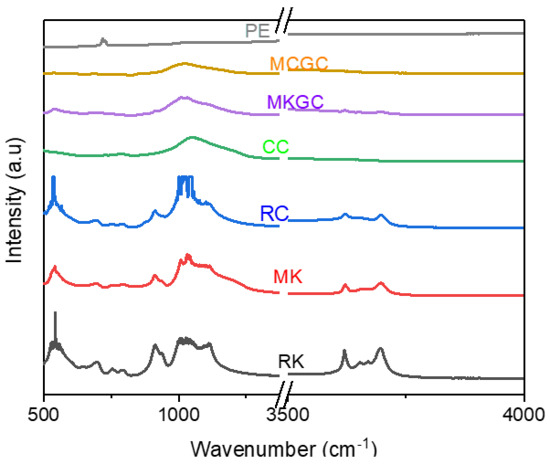 FT-IR spectra were obtained for RC and RK before, and after calcination for MC and MK. Further, FT-IR spectra was obtained for the geopolymer ceramics (MCGC and MKGC). The measurements were obtained between 500 cm−1 and 4000 cm−1 (Figure 6). The spectrum of the raw clay (RC) and raw kaolin (RK) had bands mostly between 550 cm−1 and 1200 cm−1, and between 3600 cm−1 and 3750 cm−1, corresponding to the stretching of O-H bonds and H-O-H bonds’ vibrations [44]. The small bands between 700 cm−1 and 900 cm−1 correspond to octahedral Al-O bonds present in raw clay and calcined clay. This is associated to the increase in the aluminum quantity during curing [45]. Slight changes in IR spectra bands were found in the calcined clay (MC) and calcined kaolin (MK), corresponding to bands at 560 cm−1 and 1050 cm−1 attributed to plane and bending vibrations of Al-O/Si-O, respectively [46]. Asymmetric stretching of Si-O or Al-O between 900 cm−1 and 1100 cm−1 shows the amorphous nature of geopolymer ceramic (MCGC and MKGC) and absorbed water molecules during geopolymerization. The variation assigned to (Si, Al)–O–Si structures can be attributed to the addition of alkali solution and earth metals [44], which enhances reactivity during geopolymerization and increases the strength of the composite [38,47,48].