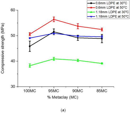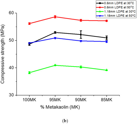 Figure 8b is a plot of compressive strength of geopolymer ceramics formed with metakaolin. Similar to the observation made for MC samples, the addition of LDPE particles increased the compressive strength of the geopolymer ceramic. The largest increase was observed for 5% LDPE powder; an LDPE percentage greater than 5 weight percent decreased the compressive strength. Similar to the observation made for the MC samples, MK compressive strength corresponding to LDPE particle size 0.6 mm was higher compared to that of 1.18 mm. These results are in agreement with previous work [54]. Research carried out on the El-Hiswa kaolinite deposits showed a compressive strength of 44.4 MPa with 16% NaOH at 80 °C for 14 h [55]. The measured compressive strength (56.8 MPa) for geopolymer ceramics formed with NaOH, sodium silicate/NaOH after being cured at 60 °C for 24 h in this work was higher than that of Rahier et al. (2011). The higher compressive strength in his study was due to of LDPE particles added to the geopolymer.