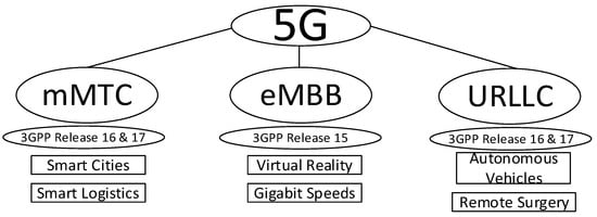 As can be seen in Figure 1, 5G communications comprise different groups of use cases in order to support different services: Enhanced Mobile Broadband (eMBB), massive Machine-Type Communications (mMTC) and Ultra Reliable Low Latency Communications (URLLC). These groups of use cases support the concept entitled network slicing, which aims to provide to different users the requirements of the services that are being utilized. For example, autonomous vehicles require communications that are highly reliable and almost real-time, which are supported by URLLC. On the other hand, smart cities require extremely high number of devices with low power consumption, which are supported by mMTC.