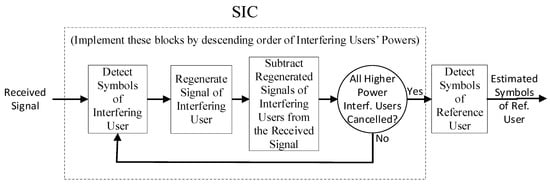 In case the reference user presents higher power, the SIC is not able to cancel interference and the lower power users represent residual interference. Note that the SIC introduces a delay in the signal corresponding to one symbol period for each cancellation stage, i.e., for each cancelled user. Assuming, e.g., that the reference user is the third more powerful user, this means that the two more powerful users need to be cancelled, introducing a delay of two symbol periods in the signal detection. However, these delays can be reduced if a fast processing is employed (in general, we can have a single symbol delay (to receive the full block) plus the processing delay for each iteration, with the later dependent on the signal processing approach)
