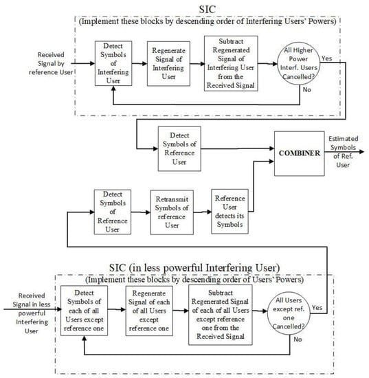 As can be seen in Figure 3, two different scenarios exist in conventional NOMA: (1) signals with power levels higher than the reference user are estimated and cancelled using a Successive Interference Cancellation (SIC), before the reference user’s signal is detected; (2) signals with power levels lower than the reference user are not cancelled, as they represent low level of interference. Instead of conventional NOMA, cooperative NOMA can be employed. In this latter case, all interfering signals can be cancelled, including those with lower powers than the reference one.
