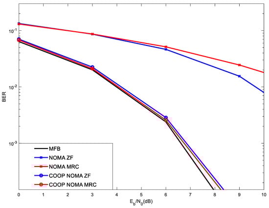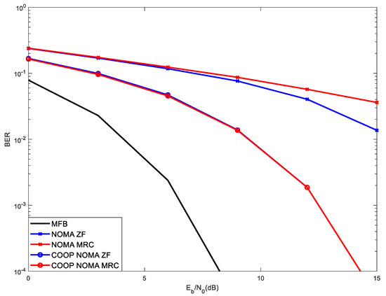 Figure 7 shows the BER performance in the same scenario as that of Figure 6 with the difference that the power of users is [0.5 1]. In this scenario, the reference user tends to be closer to the base station (power 0.5), while the interfering user tends to be further from the base station (power 1). As previously mentioned, we refer to the distance from the base station only for explanation purposes, as the fading or the power control can also make the received power suffer variations. Noteworthy is that the conventional NOMA receiver comprises the detection, regeneration and cancellation of the users’ signals by their descending order of powers (up to the power of the reference user), before the detection of the reference user takes place. Consequently, the detection of the reference user tends to be clean of interferences and the performance achieved with conventional NOMA is already good. In this scenario, since the reference user presents a power level (e.g., 0.5) which is 3 dB lower than the interfering user (e.g., 1), such signal detection is not carried out in the SIC receiver of the interfering user and Cooperative NOMA is not implemented, as it does not bring any added value. Moreover, note due to its lower power, the SIC of the reference user, using the mode of conventional NOMA, is now able to cancel the interfering signal, as the power of the interfering user is higher, making the effectiveness of cooperative NOMA useless.