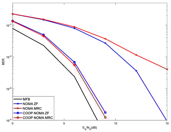 Figure 6 shows the performance results for conventional NOMA (designated in figures as “NOMA”) and Cooperative NOMA (designated in figures as “COOP NOMA”), with 4 × 32 MIMO, considering two receivers: ZF and MRC. Two NOMA users were considered in the simulation, with receive power levels [1 0.5], where the first value in the vector [1 0.5] (1, in this case) corresponds always to the power of the reference user, being the other value the power of the interfering user (0.5, in this case). In this scenario, the power of the interfering user is 3 dB lower than that of the reference user. Weak users are those that tends to be further from the base station (can also be due to e.g., fading) and, therefore, the propagation losses are higher. With NOMA, this is mitigated by employing higher transmit power. Therefore, it is assumed that the interfering user with transmit power 0.5 tends to be closer to the base station than the reference user, whose transmit power is 1.