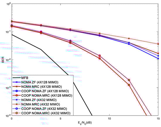Figure 10 shows results in the same scenario as those of Figure 9, making a comparison between 4 × 128 MIMO against 4X32 MIMO, with 5 NOMA users with received power levels [2 1 0.5 4 8] (2 is the received power of the reference user). As expected, due to higher level of diversity, 4 × 128 MIMO outperforms 4 × 32 MIMO. Therefore, the use of higher MIMO diversity can be viewed as a mechanism to mitigate the degradation of performance that results from a higher number of NOMA users. In other words, the increase of NOMA users can be compensated by employing a higher number of MIMO receiving antennas.
