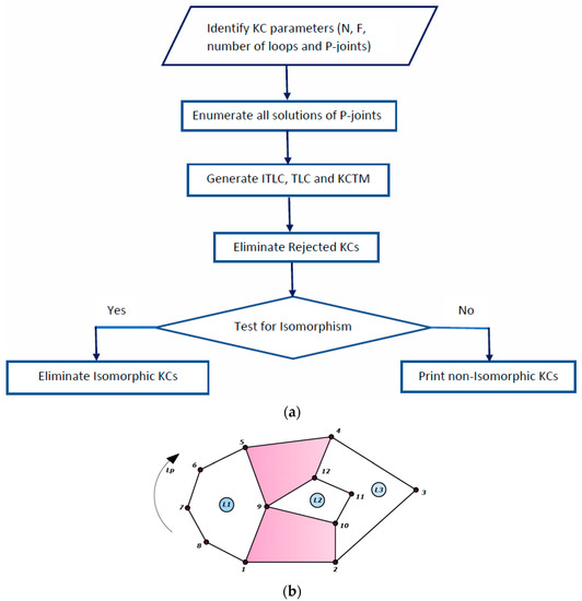 (a) Proposed algorithm flow chart. (b) Example for a 10-bar kinematic chain with 3-DOF.