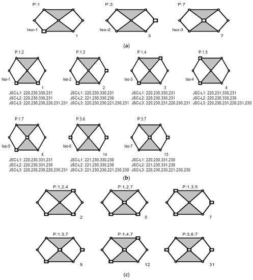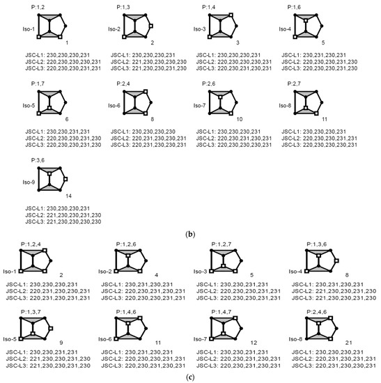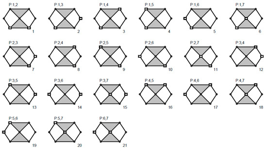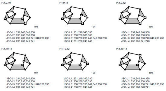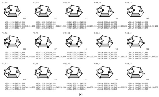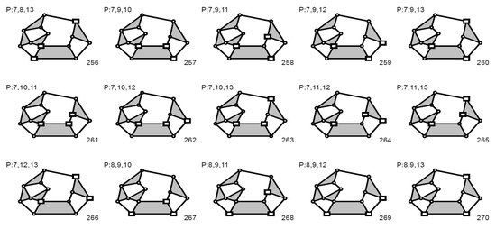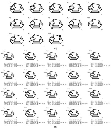 A single-DOF 10-bar chain has 13 revolute joints as indicated in Figure 4a. For the assignment of 3P-joints to a 10-bar chain, there will be 286 available configurations. Using the developed VC++ code, all configurations are enumerated automatically as shown in Figure 5. Each configuration has a notation of P-joint labels that have been transformed from revolute into P-joints.
