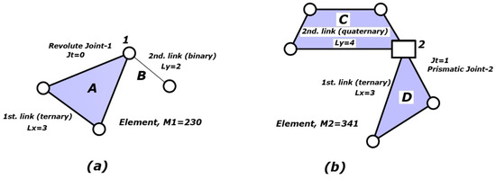 According to Figure 3a, links A and B are connected by R-joint, so that joint ‘1’ can be represented by an element M1 = 230. Figure 3b illustrates joint ‘2’ that connects links C and D by a P-joint, so that joint ‘2’ can be represented by an element M2 = 341.
