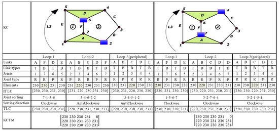 Loop-1, in Stephenson KC shown in Figure 4b, has three joints 1, 5, 7 of the same value M = 230. Hence, the sorting direction will be clockwise starting with joint-7. Therefore, loop joints sorting will be (7-1-5-6). Sorting also can start with joint 5 in an anticlockwise direction. In loop-2, joint-3 connects two binary links i.e., it has the higher priority with M3 = 220. The nearest joints (4, 2) have the same priority with M2 = M4= 230. If the consequent joints (6, 7) are compared, joint-7 has a higher priority with M7 = 230. Therefore, the direction of sorting is clockwise starting with joint-3 and joint sorting will be (3-2-7-6-4).