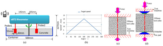 Schematic diagram of eBT2 rheometer (a), rotational speed (b), compressive test (c) and splitting test (d).
