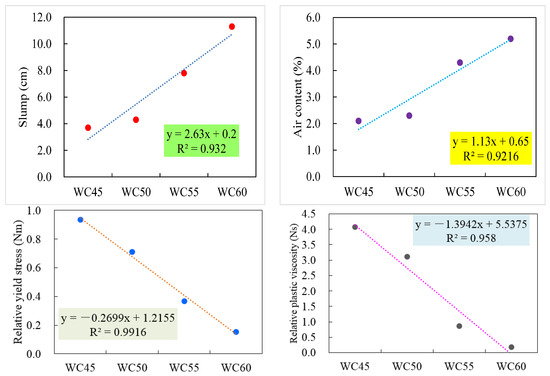 According to the fitting results of the linear relationship in Figure 3, the fitting effect of the four relationships between WC and rheological parameters is good, R2 is more than 0.9, close to 1. The linear fitting effect between WC and yield stress is the best, R2 = 0.9916. The WC vs. air content is the worst, R2 = 0.9216. The bubble system in fresh wet shotcrete becomes unstable due to high WC, which may be the reason for poor fitting effect of air content.