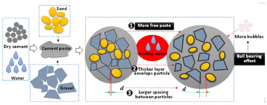 Figure 3 describes the effect of WC on the properties of fresh wet shotcrete. When WC increases from 0.45 to 0.60, the slump and air content increase, while the rheological parameters (relative yield stress and viscosity) decrease. It can be explained that the larger the WC, the more the free water content in the fresh wet shotcrete, the thicker the outer paste coating of the particles, the larger the spacing between particles, and the bigger the fluidity. In addition, fresh concrete with higher fluidity creates more opportunities for the introduction of air bubbles into the concrete mixture [49]. On the contrary, these bubbles act as “ball effect” to improve the fluidity of fresh wet shotcrete. This schematic diagram is shown in Figure 4. These trends are similar to Yun’s report [35], where they measured rheological properties using an IBB rheometer with an H-shaped impeller. The internal structure of the two rheometers is different, such as the shape of the rotor, rotation speed, the size of the rheometer and the distance between the inner and outer rotors. Hence, the relative rheological values measured in the two studies are different. However, the rheological parameters obtained in this study also provide meaningful practical knowledge for guiding the mix proportion of wet shotcrete.
