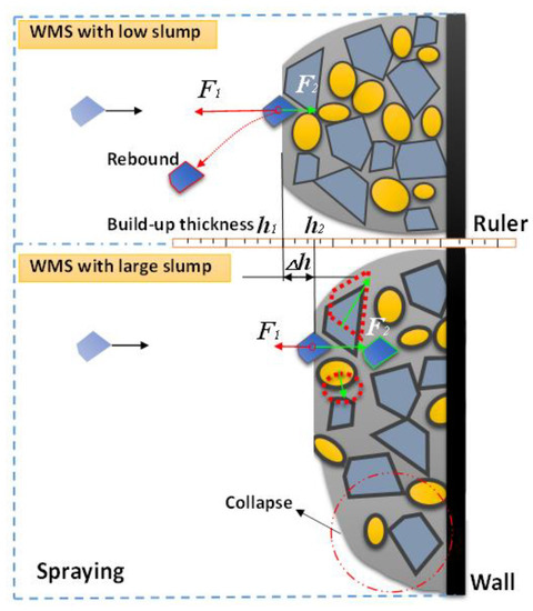 It can be seen from Table 3 that with the increase of WC, the pressure drop decreases, i.e., smaller rheological parameters (yield stress and plastic viscosity) help to improve the pumping performance of fresh concrete. However, the high WC reduces the build-up thickness of concrete, and the shootability of fresh concrete with good pumping performance is poor. The author [35] also pointed out that high WC might be beneficial to pumping performance, but low viscosity and low yield stress might reduce the thickness of the build-up layer. From another point of view, Pfeuffer et al. [50] pointed out that based on the assumption of better aggregate embedding, the viscosity and yield stress of shotcrete need to be lower to minimize the rebound rate. As shown in Figure 5, the wet shotcrete with low fluidity has a strong cohesive force, which increases the accumulation thickness h1. At the same time, we redefine F1 as the force that prevents particles from entering the shotcrete matrix, because the F1 is greater than the incident force F2, it may cause certain rebound. On the contrary, wet shotcrete with high fluidity provides convenience for aggregate embedding and reduces rebound. However, it is easy to collapse, resulting in a very thin accumulation of h2.