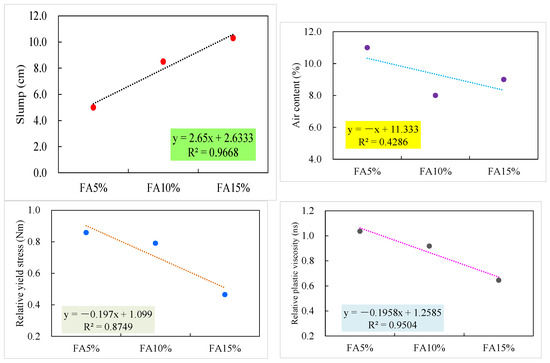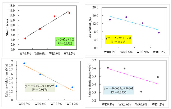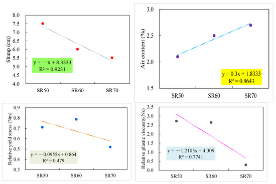 According to the linear fitting results in Figure 6, the fitting effect between SR and slump or air content is good, R2 is greater than 0.9. However, the fitting of rheological parameters is poor, the relative yield stress R2 = 0.479, the relative viscosity R2 = 0.7741, which may be due to the introduction of superplasticizer in SR70.