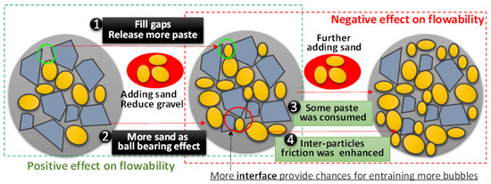Schematic of the effect of sand ratio (SR) on the flowability.