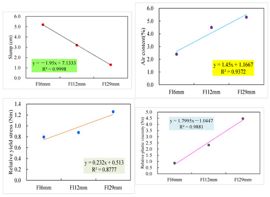 According to the linear fitting results in Figure 8, the fitting effect of fiber and slump is the best, R2 = 0.9998, and the fitting effect of yield stress is the worst, R2 = 0.8777. The prediction results of the influence of fiber on rheological properties and air content may be used in practice.