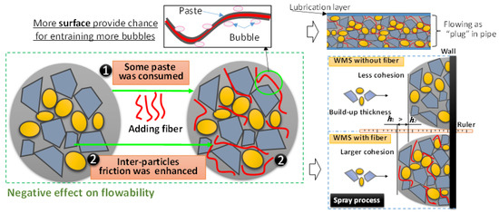 Figure 8 shows the relationship between fiber length and rheological properties, and air content. The air content, relative yield stress, and viscosity showed an increasing trend while slump decreases with the increase of fiber length. The results show that the fiber has an adverse effect on the fluidity with high yield stress and high viscosity, which is consistent with the results confirmed by Sivakumar et al. [60]. The reason may be that the specific surface area of long fiber is large, which can consume a part of free cement paste, and the friction between particles and aggregate increases with the increase of fiber length. Tabatabaian et al. [20] indicated the existence of fiber hinders the flow of cement paste. In the same way, increasing the total surface of the solid after mixing the long fibers will cause more bubbles to be entrained in, resulting in a higher air content in the “FI29 mm” mixing ratio. The schematic diagram of FI affecting fresh shotcrete characteristics is shown in Figure 9.