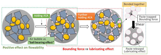 Figure 10 shows that with the increase of air-entraining agent content, the air content slump increase, while the relative yield stress and viscosity decrease. The results show that adding more air-entraining agent in fresh wet shotcrete will produce a lot of bubbles, which plays a role of “ball effect”. These entrained bubbles play a key role in lubricating aggregate and further affect the consistency of fresh wet shotcrete. The fluidity of wet shotcrete is improved, the slump is increased, and the yield stress and viscosity are reduced. Similarly, Yun et al. [35] has been pointed out that the torque viscosity decreases significantly with the increase of air content. However, in an earlier study [61], the author showed that there was a critical air content of 5%, before which both flow resistance and torque viscosity decreased; after this point, the two rheological parameters tended to be stable. In our study, when 0.02% air-entraining agent is mixed, the air content reaches 13.5%, far exceeding the critical value of 5%. The corresponding criterion in reference [61] is invalid. This difference can be explained by two factors: one is the application of different types of test equipment or the type of fresh concrete (ordinary concrete with aggregate size greater than 30 mm and shotcrete with maximum particle size of 10 mm); the other can be found in [58]. The author [58] proposed that since bubbles are attracted to the cement particles to form a bubble bridge, which increases the bond strength between cement particles (similar to flocculated particles), the entrained bubbles may lead to an increase in yield stress. Once the bubble bridge breaks under strong shear, some of the retained paste is released, apparently acting as a lubricant, as shown in Figure 11. We can conclude that bubbles have two functions: binding and lubrication. Both are related to shear strength and aggregate parameters. Therefore, some reports [62,63] show that the yield stress increases or remains stable with increasing air content.
