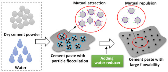 Figure 12 shows that the relative yield stress, viscosity, and air content decrease with the increase of water reducer dosage from 0.3% to 1.2%, while the slump is opposite. Under the same water–binder ratio, the fluidity of fresh concrete is greatly improved when the quality of water-reducing agent is mixed. When 1.2% water-reducing agent is added, the slump value reaches 15.1 cm, which is much higher than that of wet shotcrete with other admixtures. There was no bleeding or separation during tests. Jiao et al. [58] indicated that the spatial resistance effect of water-reducing agent is one of the reasons for this phenomenon. After adding water reducer, the yield stress and viscosity of fresh concrete decrease significantly. As shown in Figure 13, after adding water reducer, the flocculability of cement particles decreases because water reducer makes cement particles bringing same charge. In addition, the efficiency of water reducer also depends on the adsorption of water-reducing agent molecules to cement particles and the repulsion force produced by adsorption molecules. Kwan et al. [64] found that the addition of water-reducing agent increases the effective layer thickness of cement particles covered by paste. The increase of the bridging distance between particles reduces the maximum attraction between particles. Perrot et al. [65] concluded that with the increase of water-reducing agent dosage, the average surface spacing increases, and the colloidal interaction and flocculation degree between particles are reduced, thus reducing the rheological parameters of fresh wet shotcrete.