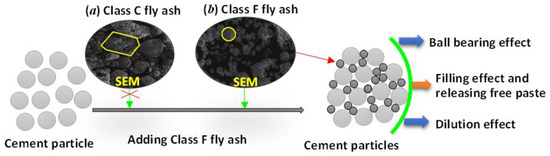 As shown in Figure 14, with the increase of fly ash content from 5% to 15%, the slump value increases more than twice, and the relative yield stress and viscosity decrease by about 50%. Generally speaking, the fluidity of shotcrete can be significantly improved by adding fly ash. Similar results with positive effect of fly ash on fluidity are also reported in references [66,67]. According to the pumping test in Table 3, adding fly ash can improve the pumping performance, reduce the pressure drop, but reduce the sprayability, and the build-up thickness is small. This phenomenon may also be attributed to the “ball effect” and “free paste effect”. The content of CaO in the fly ash used in this test is less than 10%, which belongs to Class F fly ash. The fly ash particles have spherical geometry and smooth surface (Figure 15 [68]) to enhance the “ball bearing effect” by reducing friction and promoting sliding between angular particles. Vance et al. [69] pointed out that this effect will be amplified with the widening of fly ash particle size distribution. Fly ash, as a fine particle with a particle size of 0.4–100 μm, fills the gap between larger particles, and extrudes the original water in the gap to increase the volume of free paste, which is called free paste effect. The use of fly ash instead of cement reduces the cement concentration and further reduces the flocculation of cement particles. In addition, because the specific gravity of fly ash particles is lower than that of cement particles, the volume of paste will increase when fly ash replaces cement with the same quality. Therefore, more free paste volume as lubricant increases the fluidity of wet shotcrete, which is called dilution effect. The influence of fly ash on the fluidity of fresh concrete is shown in Figure 15.