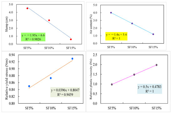 As shown in Table 3, the increase of yield stress and viscosity is beneficial to build-up thickness. Due to the additional flocculation of silica fume, the bond strength of concrete mixture on surface sprayed is enhanced, and the segregation and bleeding in the pumping process are reduced. Beauprep [31] gave a similar result, i.e., when 10–15% silica fume is added to wet shotcrete, silica fume has a positive effect on both sprayability and pumpability. It can be seen from the fitting results in Figure 16 that the silica fume has a good fitting effect on the air content and rheological parameters.