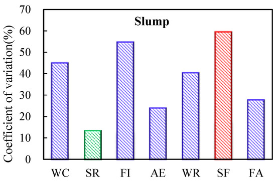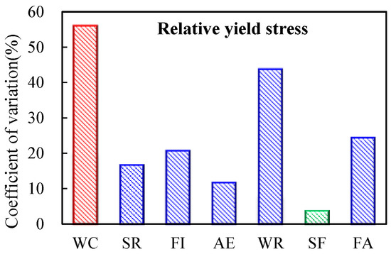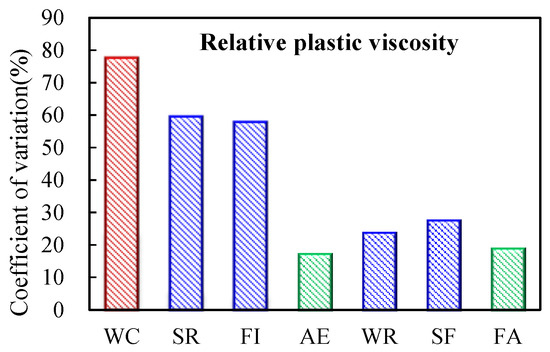 According to the experimental data of rheological parameters and air content, the influence degree of rheological properties and air content are analyzed within the range of variables set in this test. To eliminate the influence of different factors on the measurement scale, the “coefficient of variation” analysis method is adopted [70,71]. Calculation steps: (1) calculate the average value and standard deviation of the same project affected by a different degree of influencing factors; (2) divide the standard deviation by the average value, and the result is “coefficient of variation”; (3) plot the coefficient of variation into a graph. The corresponding results are shown in Figure 17, Figure 18, Figure 19 and Figure 20. The greater the coefficient of variation, the greater the influence of each factor on wet shotcrete.