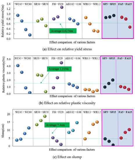 Figure 6 shows that with the increase of SR, the slump decreases gradually, while the air content increases. Within the range of 50–60% of SR, the relative yield stress increases, and the relative viscosity changes slightly with a downward trend. Some researchers [51,52,53] have reported the same result that increasing strontium increases the yield stress but decreases the plastic viscosity. Westerholm et al. [54] also found that natural fine aggregate has little effect on plastic viscosity.