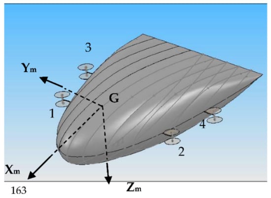 Let us note that this mass matrix comprises the terms of inertia of a solid body, but also the terms of added masses. The acceleration of a moving body in a fluid creates a resistance force exerted by the latter, proportional to the acceleration of the solid. This force can therefore be likened to an increase in the mass of the solid, hence the notion of added mass. The values of these added masses are important and not negligible in the case of submarines or airships [27]. The computation of these added masses can be done thanks to experiments, or analytically as was done, for example, for the MC500 [28].